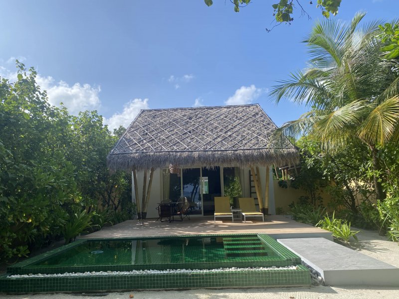 Naším domovem se na čtyři noci stala plážová vilka v jihovýchodní části ostrova, která pro nás byla ideální volbou. Byť jsou plážové vilky koncipovány jako dvojdomky, nabízí dostatek soukromí, zeleně a z vilky přímý vstup na pláž a do laguny. Vilky jsou zařízené jednoduše a kombinují prvky světlého dřeva s modrou barvou. Na ložnici s obývacím prostorem navazuje z jedné strany částečně otevřená koupelna umístěná směrem do vnitrození ostrova, z druhé strany je umístěna terasa s denní postelí. Každá vilka má před vilou přidělena také svá lehátka a slunečník. S ohledem na deštivější počasí byla jistou nevýhodou částečně otevřená koupelna, kde se občas hromadila voda.