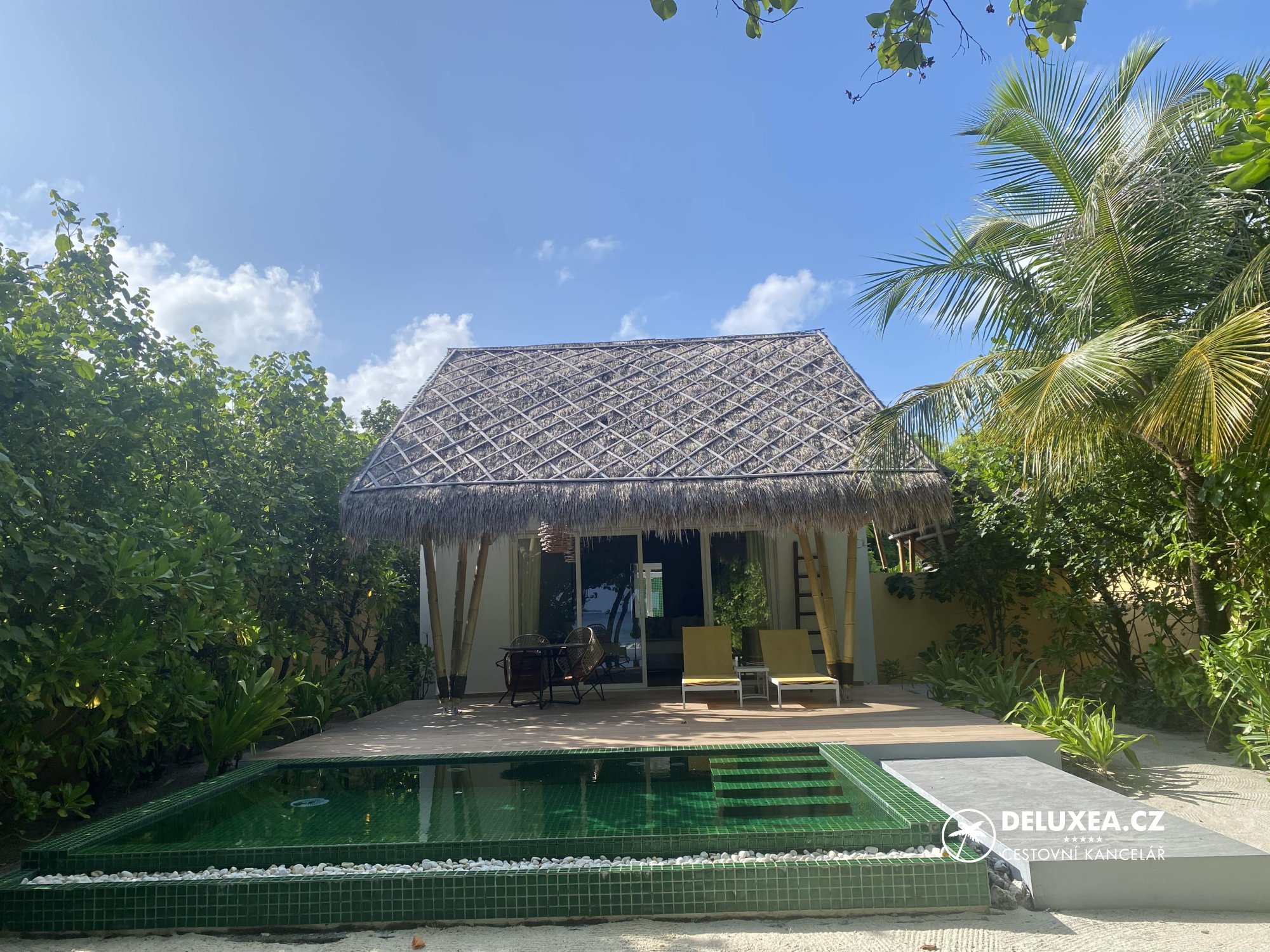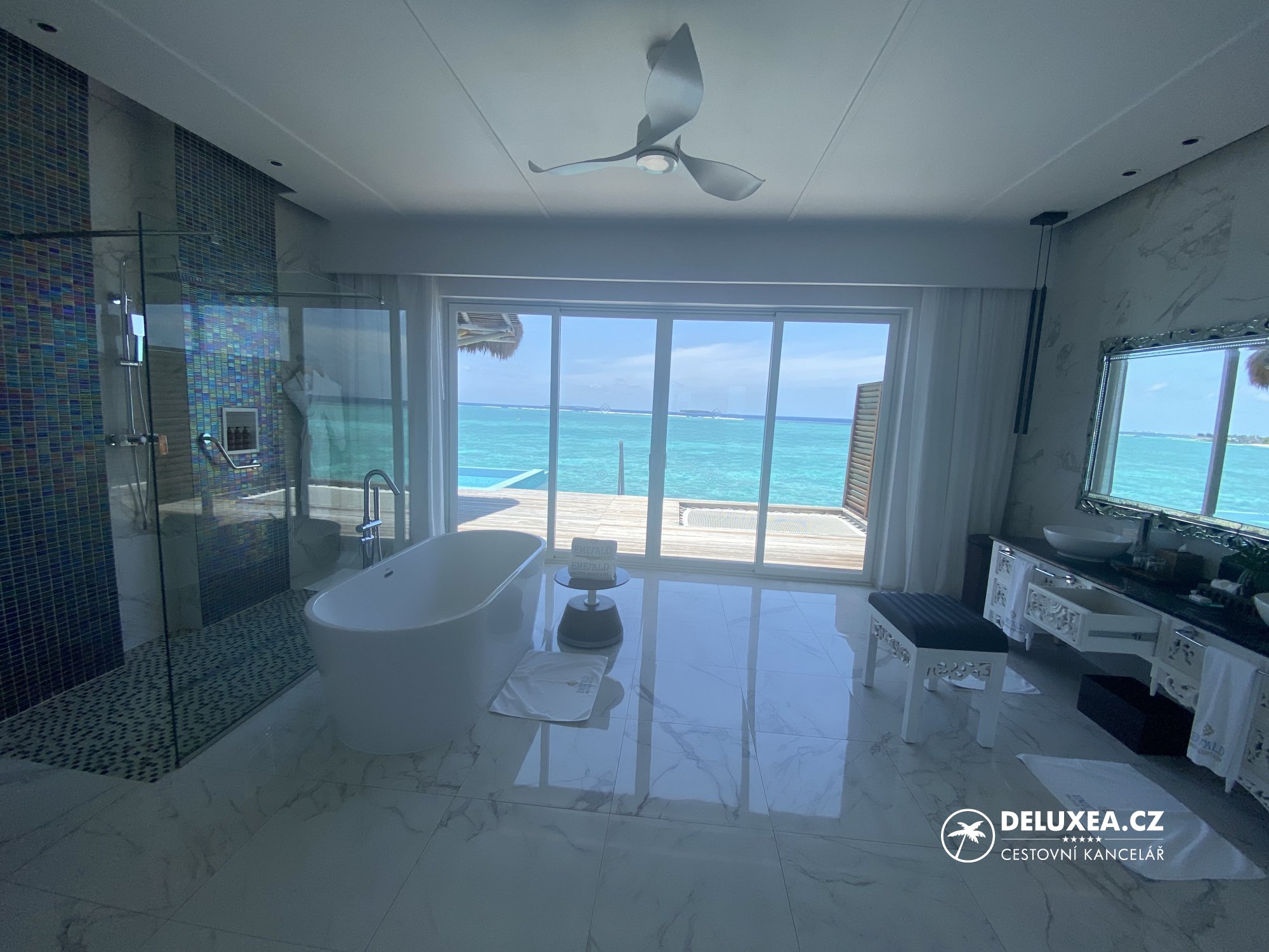 Emerald Maldives se nachází v Raa atollu a byl otevřen v roce 2019. Resort skvěle kombinuje moderní design s tropickým přírodním prostředím a vytváří tak atmosféru přirozené a neformální elegance. Ubytovat se můžete v 60 plážových nebo 60 nadvodních vilách, které jsou velmi prostorné. Na resortu Emerald Maldives nás uvítali proseccem již na mole a následoval přesun golfovým vozidlem až do naší vily. Oblast příjezdového mola může působit trochu neupraveně, ale zde klienti tráví minimum času, a tak to ničemu nevadí. Check in probíhá na vilce pomocí aplikace, kterou si lze dopředu stáhnout do telefonu a kde se dozvíte cenné informace. Každý večer vám také doručí program a předpověď počasí na následující den.