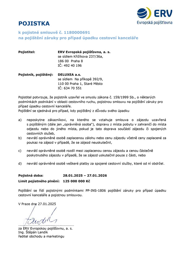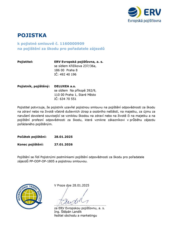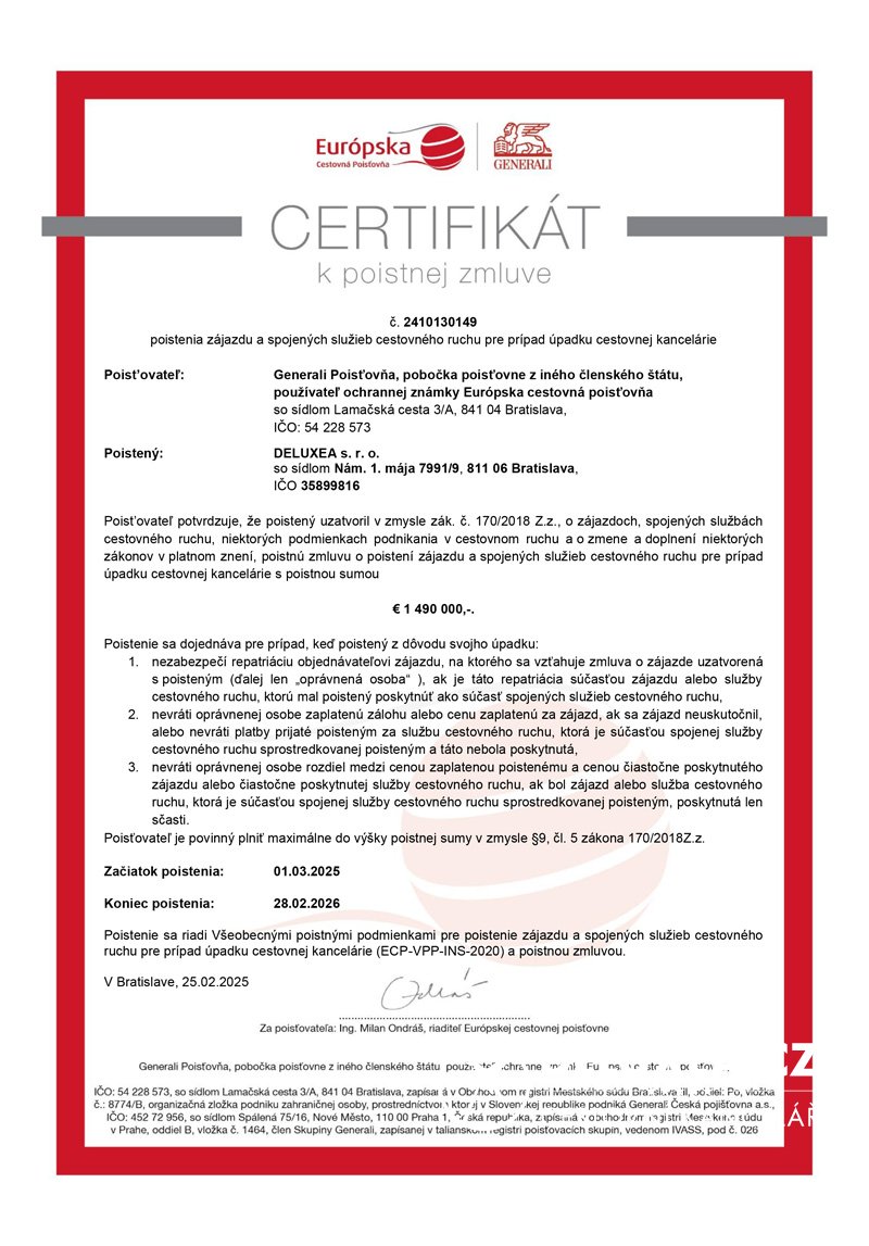 Pro jistotu vás našich klientů je cestovní kancelář Deluxea a.s. ze zákona pojištěna pro případ úpadku u ERV Evropská pojišťovna, a. s. Limit pojistného plnění má DELUXEA nastavený extrémně vysoko na 125 000 000 Kč v ČR s platností do 27.01.2026 a 1 490 000 EUR v SR s platností do 01.03.2026 . Dále máme uzavřenou i velmi nadstandardní pojistku odpovědnosti za škodu pořadatele zájezdů.