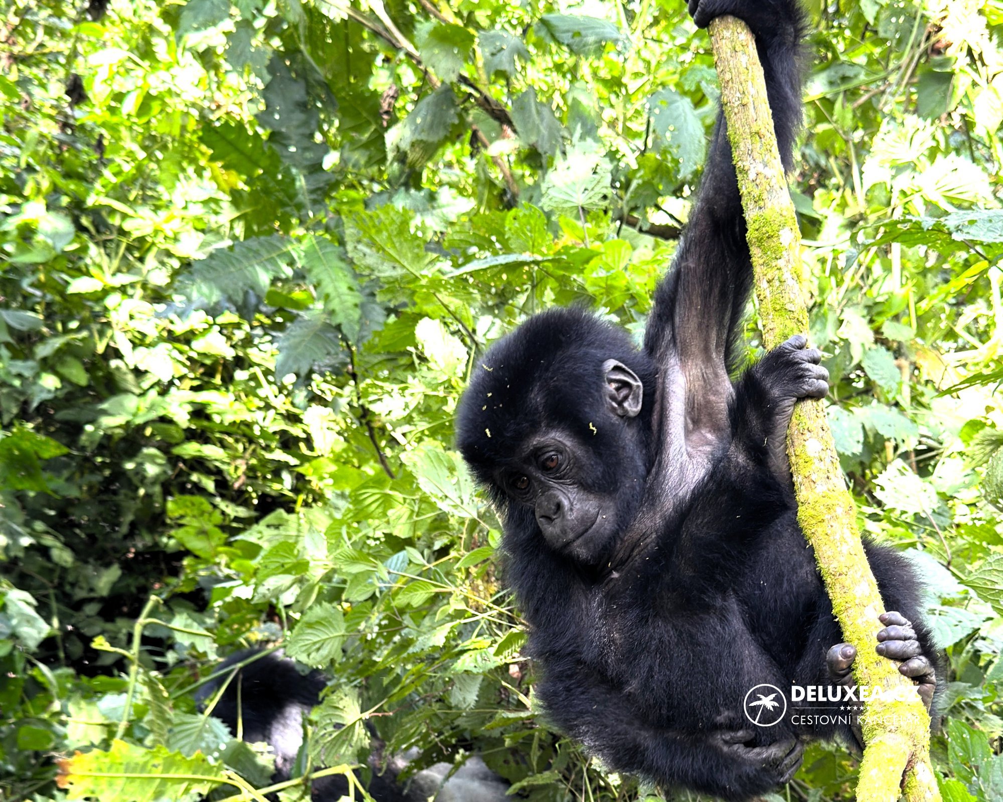 Každé gorilí skupině je přiřazena osmičlenná skupina turistů, ranger, stopaři, dva ozbrojenci a pokud chcete, najmete si nosiče. Dostanete hole a jdete. My dostali přidělenou Rwigyi group. Dva stopaři šli napřed, aby nám rodinu našli a bezpečně nás k ní mohli pozvat. Po treku se šimpanzi jsme čekali náročný trek kopci, několika hodinové hledání skupinky apod. Nicméně asi jsme měli štěstí a naše hledání zabralo jen 45 minut, což nechápal nikdo z nás…Po procházce krásným tropickým pralesem se ptám rangera, za jak dlouho si myslí, že je najdeme...on udělá jen pssst..jsou vedle nás… K odpočívající skupině po snídani musí stopaři prosekat cestičku skrz křoví a pak začne zvířecí divadlo, které nás všechny dojme…Naše gorilí rodina má vše - samce silver backa, který líně odpočívá na zemi, matku, která si hoví na větvi a tři mláďata, která jsou neskutečně hravá. Mladší mláďata, asi dvojčata, spolu neskutečně dovádí. Chvílemi šplhají, pošťuchují se, pak se houpou na větvích a liánách takovým způsobem, že nás praští do ramenou větví a najednou mládě pobíhá přímo před našima nohama. Nevíme co dřív točit, fotit, kochat se. Jedno ale víme jistě, právě probíhá náš životní zážitek…. Nelze si nevšimnout, jak moc nám jsou chováním gorily podobné. Jinak jsou gorily býložravci a denně zkonzumují opravdu velké množství jídla, žijí ve skupinách a bojují spolu jedině o území. Údajně nikdy nespí na stejném místě, jelikož tam spí, jí, ale i vylučují. Nejen proto se každý den přemísťují. Nešlo si nevšimnout, že se kolem goril rojil  hmyz a my byli vděční za dlouhé kalhoty, rukávy a roušky. Naše hodina rychle utekla a bohužel jsme se museli vrátit do základního tábora. Ranger nám udělal ještě okruh zdejší přírodou a pak na nás čekalo opět předání certifikátu.