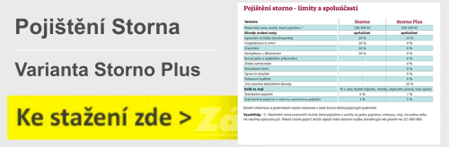 Pojištění storna Vám může ušetřit mnoho peněz, pokud budete nuceni zájezd zrušit (letenky nebo ubytování). Pojištění storna můžete vyjednat ve dvou variantách a jeho cena se počítá podle Vašeho výběru z celkové ceny zájezdu (pobyt a letenka) nebo jen z ceny za pobyt. Varianta Storno Plus je rozsáhlá ochrana pře nástupem na cestu a zároveň v případě přerušení cesty až do 100 % ceny zájezdu bez spoluúčasti. Rozšířené důvody na stornování anebo přerušení cesty. Pojištění Storna Štandard vás ochrání v případě nenastoupení na cestu anebo při přerušení cesty s 10% alebo 25% spoluúčastí.